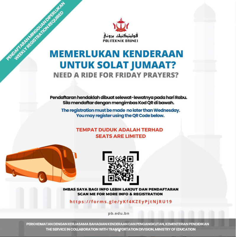 Bus Services Daily Bus – Click the following link to register https://pb.edu.bn/daily-bus Friday Bus – Click the following link to register https://pb.edu.bn/friday-bus