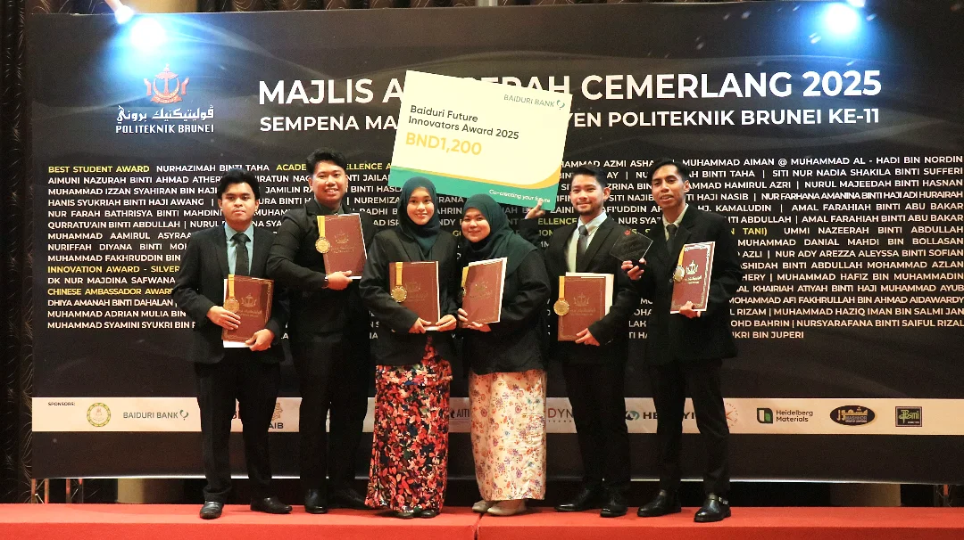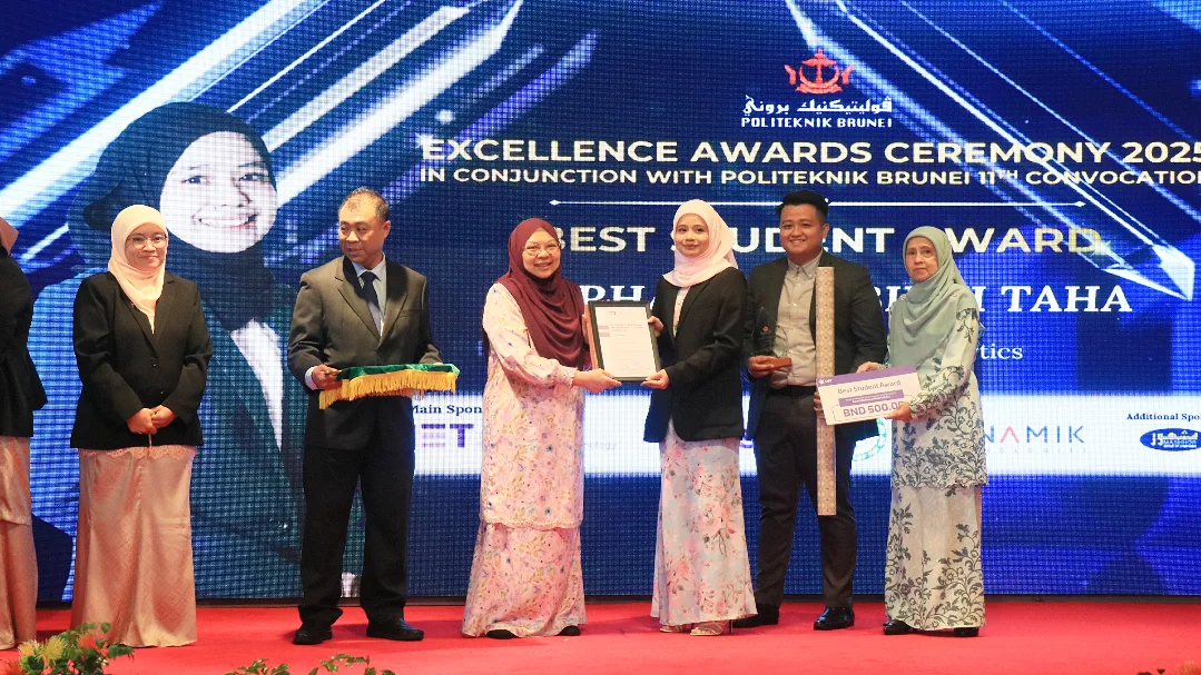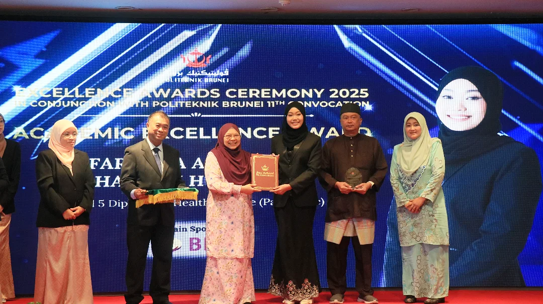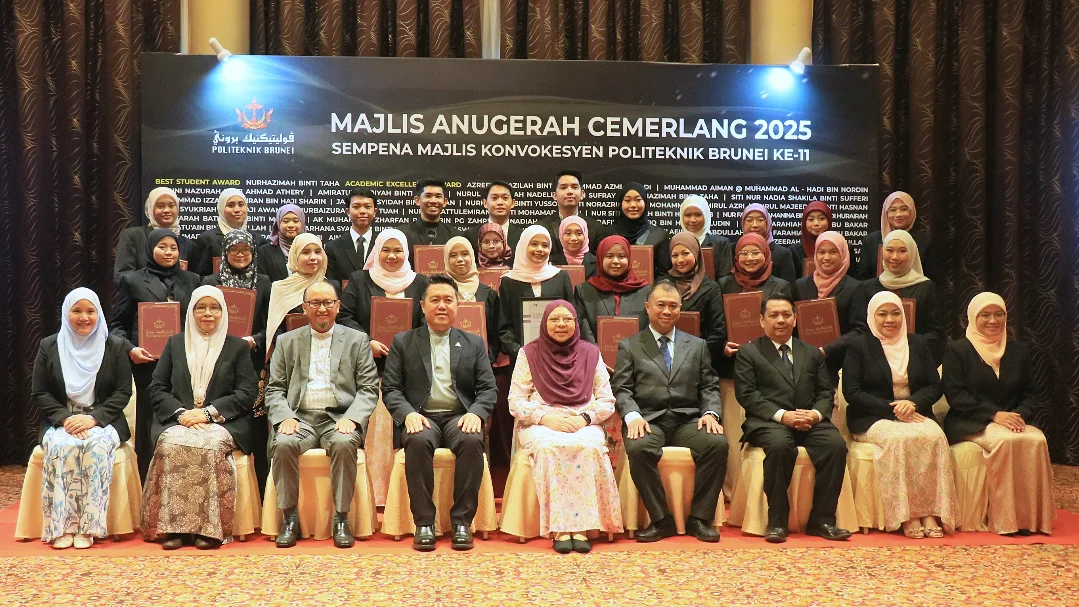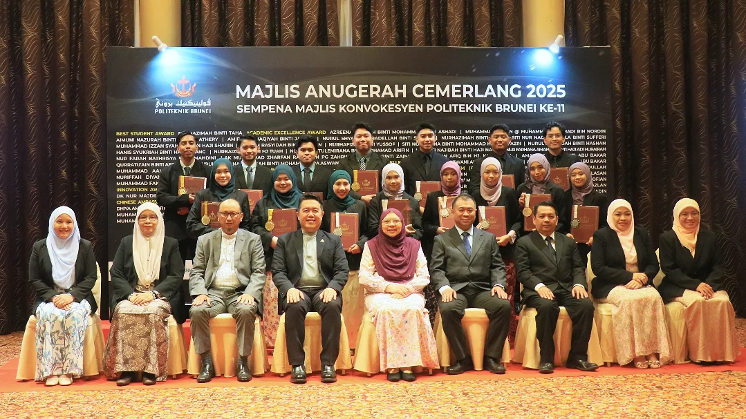 28 October 2025 – In conjunction with the 11th Politeknik Brunei Convocation, Politeknik Brunei held the Excellence Award Ceremony 2025 at the Goldstone Ballroom, The Centrepoint Hotel, Gadong. The ceremony celebrated 28 selected award recipients from the Class of 2025 for their outstanding achievements. The recipients comprised graduates and students from five schools: the School of Business, School of Information and Communication Technology, School of Science and Engineering, School of Health Sciences, and School of Petrochemical.