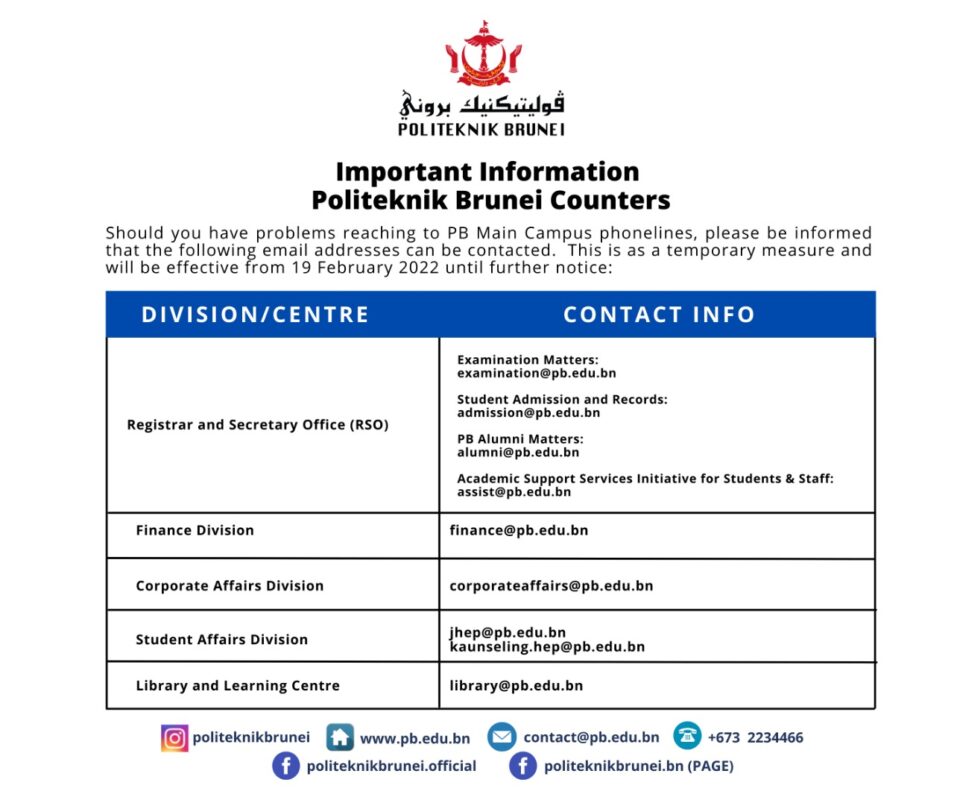 Bandar Seri Begawan, 18th January 2022 Politeknik Brunei (PB) is holding its Orientation Week for its 11th Intake, January 2022 Session, Academic Year 2021/2022 for four days starting from the 18th until 22nd January 2022. This is the first time it is held virtually, taking into account PB existing Standard Operating Procedure (SOP) to jointly […]
